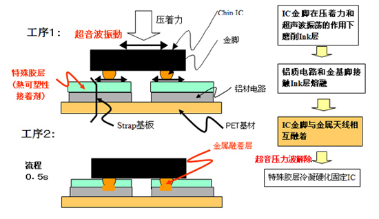 一個完整的Inlay(未封裝的RFID標簽)是由IC組件和天線部分壓焊而成的,具體而言,JOMFUL技術就是在Inlay的壓焊過程中,第一步,通過超聲波壓力振蕩使IC金腳磨削熱可塑冷凝材料層,使之被熔融穿透,並使IC金腳直達天線鋁質基材層;第二步,繼續施加超聲波壓力振蕩,使IC金腳與鋁製基材互相熔融嵌合;第三步,去除超聲波壓力,此時,在第一步驟中熔融的熱可塑層將隨之固化,起到固定IC的作用,IC與金屬天線之間也完全冷凝融合。