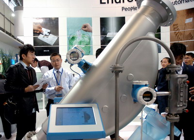 圖:參展商展示世界最大的管徑達到10寸的科氏力質量流量計,該設備廣泛運用在石化、醫藥等工業領域。
