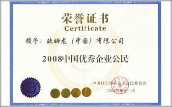 11月16日,由中國社工協會企業公民委員會、中央電視台經濟頻道、騰訊公益慈善基金會聯合主辦的旨在弘揚企業社會責任、樹立財富新觀念的“2008第四屆中國企業公民論壇暨表彰大會”在人民大會堂舉行。歐姆龍(中國)有限公司第四次獲得優秀企業公民稱號。