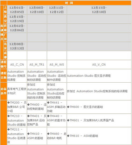 2.選擇培訓地點:貝加萊在全國有六個培訓中心——上海、西安、濟南、廣州、北京,成都。 客戶可根據需要選擇和聯係我們當地的培訓中心。請注意:各培訓中心的課程種類有所不同,每個中心的開課情況請參看培訓日期安排表。