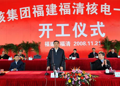 根新華社福州11月21日電 21日,中共中央政治局常委、國務院副總理李克強出席了福建福清核電工程開工儀式並宣布開工。他強調,要以對國家和人民高度負責的精神,堅持安全第一、質量第一,精心組織,精心施工,努力把福清核電站建成精品工程。要認真落實黨中央、國務院關於擴大內需促進增長的政策措施,把工作做實做細,保持經濟平穩較快發展。