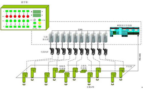 電氣係統方麵,由調平PCC控製器、伺服電機與驅動器、水平傾角傳感器以及調平機櫃、人機界麵、傳感器與伺服電機電纜構成;機械機構方麵,調平係統的執行機構由電機驅動的調平支腿構成,其結構由絲杠(滑動/滾動)、套筒、支承單元、安裝座和電氣限位開關等構成。係統如下圖所示: