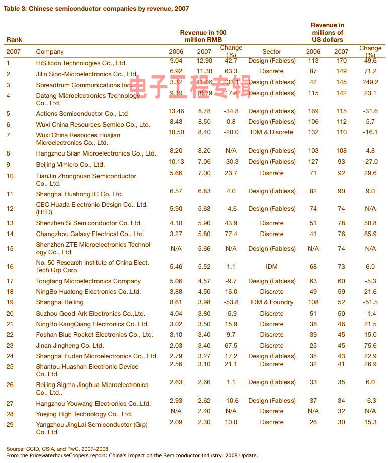 根據PwC的報告,2007年排名首位的中國本土芯片公司是海思半導體(HiSilicon),銷售額達到1700美元,海思曾是華為技術公司的芯片研發部分,並在2005年部分拆分出來。