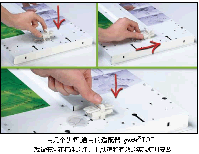 工(gong)業(ye)中(zhong)已(yi)經(jing)接(jie)受(shou)了(le)通(tong)用(yong)標(biao)準(zhun)的(de)燈(deng)具(ju)用(yong)於(yu)插(cha)拔(ba)安(an)裝(zhuang)方(fang)式(shi)的(de)想(xiang)法(fa)。直(zhi)到(dao)現(xian)在(zai)插(cha)拔(ba)式(shi)燈(deng)具(ju)在(zai)某(mou)些(xie)項(xiang)目(mu)上(shang)被(bei)限(xian)製(zhi),它(ta)們(men)有(you)利(li)於(yu)降(jiang)低(di)成(cheng)本(ben)和(he)有(you)利(li)於(yu)燈(deng)具(ju)生(sheng)產(chan)商(shang)的(de)製(zhi)造(zao)和(he)物(wu)流(liu)。每(mei)個(ge)燈(deng)具(ju)可(ke)以(yi)在(zai)之(zhi)後(hou)使(shi)用(yong)gesis®TOP 的方案,這樣就可以使它成為插拔式的燈具。現在安裝者可以決定是否使用插拔方式連接燈具,和使用插拔式電氣安裝的所有優勢。