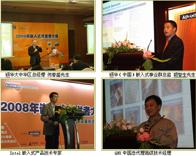 2008年,正值研華成立25周年,這次會議,研華為業內同仁傾情奉獻了這25年來研華精湛的產品技術訊息。與去年SOM(係統核心模塊)主(zhu)題(ti)不(bu)同(tong),今(jin)年(nian)的(de)會(hui)議(yi)主(zhu)題(ti)主(zhu)要(yao)集(ji)中(zhong)在(zai)當(dang)前(qian)嵌(qian)入(ru)式(shi)產(chan)品(pin)及(ji)技(ji)術(shu)的(de)最(zui)新(xin)資(zi)訊(xun)上(shang)。研(yan)華(hua)大(da)中(zhong)華(hua)區(qu)總(zong)經(jing)理(li)何(he)春(chun)盛(sheng)先(xian)生(sheng)也(ye)親(qin)臨(lin)現(xian)場(chang),與(yu)與(yu)會(hui)觀(guan)眾(zhong)分(fen)享(xiang)了(le)研(yan)華(hua)企(qi)業(ye)理(li)念(nian)以(yi)及(ji)研(yan)華(hua)的(de)全(quan)球(qiu)品(pin)牌(pai)策(ce)略(lve);研華技術專家在會上介紹了自主研發的用於嵌入式平台的高集成SoC解決方案,這個方案可以使開發工程師輕鬆完成產品開發,可以更好地利用市場機會;基於Intel最新移動平台Atom的研華嵌入式產品等,其特點是超緊湊的芯片,顯著的低能耗,能應用於更多場合;以及整合的研華嵌入式軟件服務等等,這些資訊使業內同仁受益匪淺;同時此次會議也邀請到合作夥伴Intel,QNX的嵌入式技術專家與大家分享了嵌入式平台的未來發展趨勢以及QNX嵌入式軟件係統。
