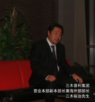 三木普利公司與羅升的合作已經30年(nian)之(zhi)久(jiu),與(yu)天(tian)津(jin)羅(luo)升(sheng)合(he)作(zuo)後(hou),在(zai)大(da)陸(lu)市(shi)場(chang)的(de)銷(xiao)售(shou)增(zeng)長(chang)率(lv)也(ye)是(shi)突(tu)飛(fei)猛(meng)進(jin),三(san)木(mu)公(gong)司(si)對(dui)此(ci)也(ye)向(xiang)羅(luo)升(sheng)公(gong)司(si)表(biao)示(shi)感(gan)謝(xie)。近(jin)日(ri),天(tian)津(jin)羅(luo)升(sheng)公(gong)司(si)訪(fang)問(wen)了(le)三(san)木(mu)普(pu)利(li)集(ji)團(tuan)營(ying)業(ye)本(ben)部(bu)副(fu)部(bu)長(chang)及(ji)海(hai)外(wai)部(bu)長(chang)三(san)木(mu)裕(yu)治(zhi)先(xian)生(sheng):