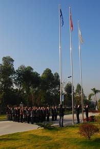 公司領導及營銷服務中心參與管理培訓的行業總經理、大區總監等列隊參加了升旗儀式。 在雄壯的國歌聲中,鮮豔的五星紅旗與智光電氣廠旗冉冉升起,迎風飄展。