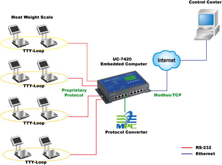 一個東歐的公司在他現場的應用中,使用了 MOXA 的 UC-7420 嵌入式計算機連接串口設備進行協議轉換工作。其設備是用於超市的天平,天平使用 RS-232 接口連接到 UC-7420 的串口,天平使用在超市中,並使用私有協議通信。為此,工程師設計這個係統需要一個智能的協議轉換器來完成天平到前端控製 PC 之間的數據發送。
