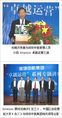 Emerson顧問、前大中華區總裁任錦漢今天應邀赴深圳中航集團,出席“卓越運營”係列專題講座。Emerson 中國區總經理趙大東也出席此次活動。在長三個小時的講座中,任錦漢介紹了 Emerson 保持連續52年紅利增長記錄的持續製勝之道,係統介紹了 Emerson 的管理過程。深圳中航集團吳光權董事長以及約250名中高層管理人員參加了此次講座。