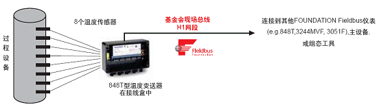 848T是基於基金會現場總線的8通道溫度變送器,-40oC~85oC的工作環境能力保證了它可以在現場安裝,並且每個848T隻占用Ff總線網段上的一個站點;故在一個網段上可以連接多個848T,或與其它現場總線儀表、閥門混合連接;多通道溫變大量節省了常規需連接到控製室內的熱電偶補償電纜或熱電阻三芯電纜。