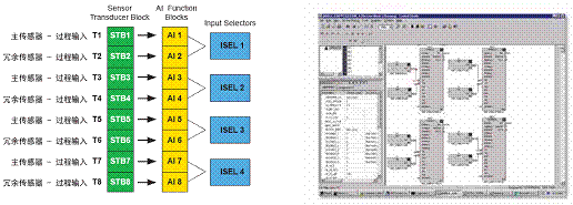針對溫度傳感器容易損壞且長時間運行、不便維修的工藝場合,848T可應用於4個分組冗餘溫度的監測,以提高現場信號的可靠性: