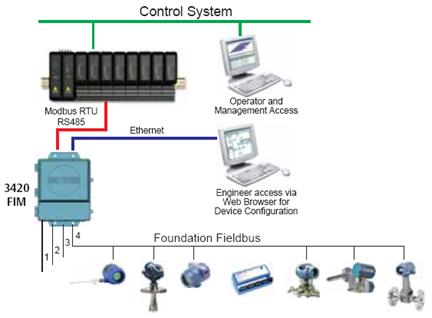 有時用戶會遇到如何在傳統的控製係統中加入FF功能的要求,比如傳統DCS改造項目中增加智能設備、上新項目但主係統是不支持FF總線的PLC控製器時;艾默生公司研發了一款現場總線接口模塊-3420 FIM,該模塊可提供4個H1網段,最多連接64個FF智能設備,它將現場的過程信號和控製指令轉換成標準的ModbusRTU或OPC通訊協議,與傳統控製係統或上位機直接通訊,並通過以太網連接AMS設備管理係統對FF智能設備進行管理和診斷,讓用戶獲得FF技術帶來的優勢和利益。