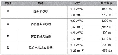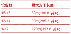 若使用屏蔽雙絞線,現場總線電纜的長度不能超過1900m(6332英尺)。其中電纜的長度為主幹長度加上所有支幹長度,在終端器之間的區域部分定義為主幹,所有離開主幹的部分稱為分支,主幹的兩端均設有終端負載。如果可以選擇支幹的長度,則越短越好。支線的總長受支幹數目與每條支幹上設備的數量限製,如下表所示。