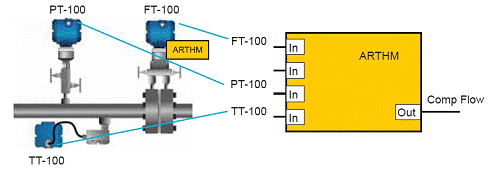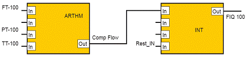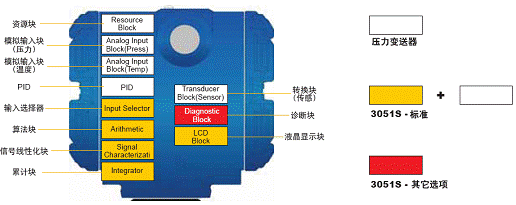 3051S在提供常規的功能塊(白色框所示)的同時,還具備了輸入選擇、算法、信號線性化、累計、顯示等標準功能塊配置,所有這些功能塊與DeltaV/Ovation係統中的功能塊是沒有任何差異的。其算術功能塊可方便地將來自溫度、壓力變送器的信號在3051S差壓變送器中計算出溫壓補償後的瞬時流量, 這樣操作人員可以在現場看到準確的、經過補償的流量值,而無需回到操作室看控製係統畫麵。