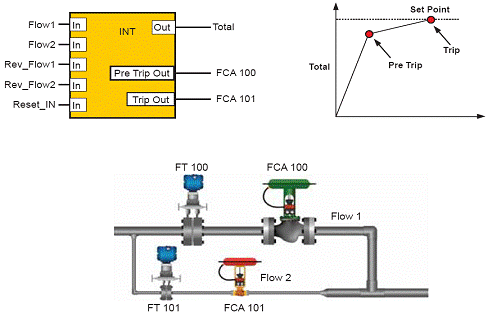 FT100和FT101分別測量大管道流量Flow1和小管道流量Flow2,其中在FT100是3051S FF差壓變送器;利用FT100的累計功能塊來計量Flow1和Flow2的總體累積量,當達到示意曲線中預設值Pre Trip點時,累積功能塊Pre Trip Out輸出開關信號關閉FCA100閥門,隻用Flow2來作流量細調;當FT100中累積到設定點(Set Point)時再由功能塊Trip Out輸出開關信號,關閉FCA 101閥門;最後實現分程精密灌裝的功能。