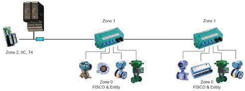 利用兼備隔離柵和接線盒功能的現場安全柵(Fieldbarrier)構成現場總線網絡的方法; Field barrier本身通常為增安型和澆封型防爆,可安裝在危險區Zone 1,內含隔離柵為EEx ia IIC,兼容FISCO和ENTITY標準,主幹線電纜的長度和分支電纜的長度隻受現場總線協議的約束(電纜總長1900米,分支見表1),不受FISCO規定的電纜長度總和不超過1000米和每分支不超過30米的限製。