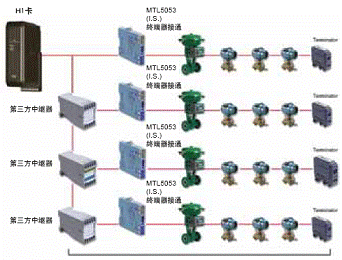 H1現場總線還可支持現場本安設備的應用。在安全區內的電源與危險區內的本安設備之間安置本安安全柵。(見圖)