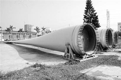 目前國內最大的2.5兆瓦風力發電項目正在廣西北海市緊張施工,預計3月份即可投產。它是當地一家風力發電設備生產企業的示範項目,高達80米的機艙由德國設計師盧吉·科拉尼(Luigi Colani)設計,巨大的風車建成後將成為當地一個標誌性景觀。機組年發電達400萬千瓦小時,可滿足1600戶居民用電。圖為已製成的長達45米的風車葉片。