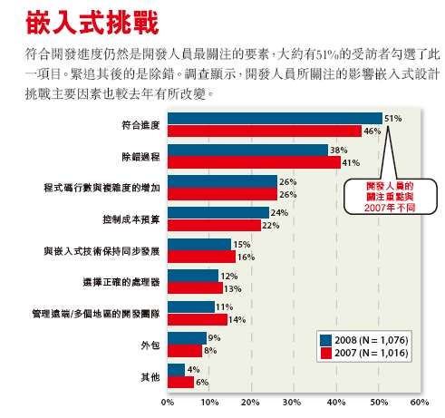 符合開發進度仍然是開發人員最關注的要素,大約有51%的受訪者勾選了此一項目。緊追其後的是除錯。調查顯示,開發人員所關注的影響嵌入式設計挑戰主要因素也較去年有所改變。