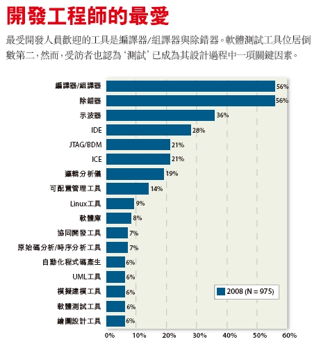 最受開發人員歡迎的工具是編譯器/組譯器與除錯器。軟件測試工具位居倒數第二,然而,受訪者也認為‘測試’已成為其設計過程中一項關鍵因素。