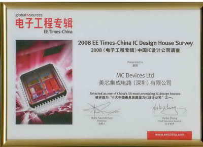 美芯被全國係統設計師評選為2008年度中國十大最具潛力IC設計公司之一,頒獎典禮於五月二十八日於環球資源總部舉行。