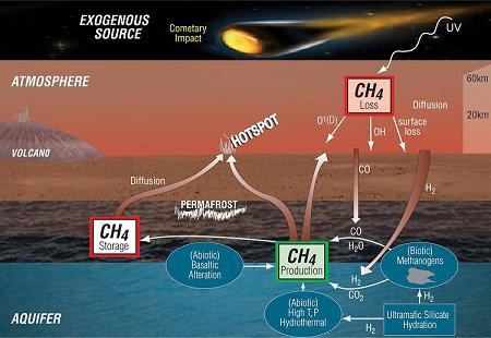 火huo星xing上shang的de什shen麼me東dong西xi會hui產chan生sheng這zhe麼me多duo甲jia烷wan呢ne?雖sui然ran產chan生sheng甲jia烷wan的de途tu徑jing多duo種zhong多duo樣yang,但dan是shi最zui後hou的de答da案an是shi生sheng物wu體ti或huo者zhe非fei生sheng物wu來lai源yuan。非fei生sheng物wu甲jia烷wan是shi在zai地di下xia的de高gao溫wen高gao壓ya環huan境jing下xia產chan生sheng的de。雖sui然ran地di質zhi過guo程cheng可ke以yi產chan生sheng甲jia烷wan,但dan是shi氫qing氣qi和he二er氧yang化hua碳tan等deng一yi些xie帶dai碳tan分fen子zi的de物wu質zhi發fa生sheng反fan應ying,也ye會hui形xing成cheng甲jia烷wan。