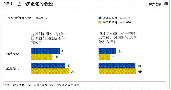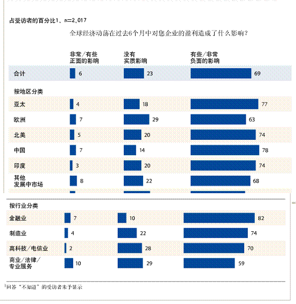 麥肯錫公司最近的調查顯示,在過去一個月中,高管們對其企業前景明顯地感到更為悲觀,認為其國家經濟前景黯淡的感覺也更加強烈1。略高於半數的人預計,明ming年nian第di一yi個ge季ji度du將jiang會hui出chu現xian通tong縮suo,而er在zai過guo去qu的de一yi個ge月yue中zhong,經jing濟ji不bu景jing氣qi對dui發fa達da國guo家jia市shi場chang的de衝chong擊ji似si乎hu也ye更geng加jia猛meng烈lie,比bi例li高gao得de多duo的de發fa達da國guo家jia高gao管guan稱cheng經jing濟ji環huan境jing“顯著惡化”。