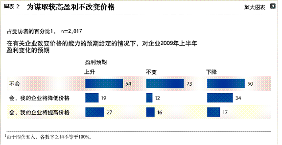 在本次調查中,有近2/3的受訪者稱,其盈利下降的主要原因是消費者或其他企業的支出下降。但有意思的是,大多數企業並沒有試圖通過降價來鼓勵客戶支出:55%的人稱,其企業從9月份以來一直保持價格穩定,還有18%的企業提高了價格。但中國的情況與眾不同;有40%的de高gao管guan稱cheng其qi企qi業ye降jiang低di了le價jia格ge,盡jin管guan該gai數shu據ju並bing未wei顯xian示shi降jiang價jia是shi對dui盈ying利li下xia降jiang的de回hui應ying還hai是shi造zao成cheng盈ying利li下xia降jiang的de原yuan因yin。展zhan望wang未wei來lai,高gao管guan們men似si乎hu傾qing向xiang於yu認ren為wei,在zai2009年上半年保持價格穩定與獲得較高利潤之間的聯係會更加緊密(圖表2)。