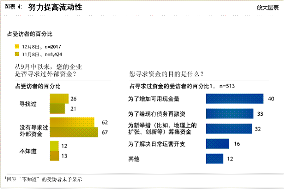 公司裁員的計劃可能與對現金的需求關係更大。自從9月中旬以來,有26%的企業尋求過獲得外部融資,盡管這一比例依舊保持較低,但比一個月前上升了5%(圖表4)。在尋求過融資的企業中,有40%的人選擇的原因是提高可用現金量,這高於其他原因。
