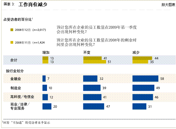 在談及自己的企業時,近70%的受訪者稱全球經濟動蕩已經導致其盈利下滑,而有半數的人預計,2009年的盈利將下滑。稱自己的企業正計劃在近期裁員的高管的比例,在過去一個月中已經從35%升至44%。