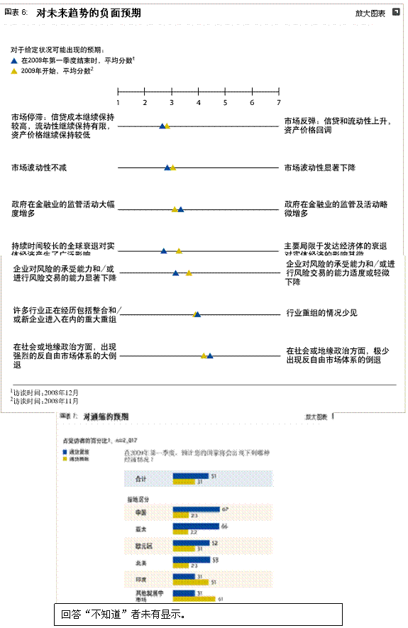 此外,有略高於半數的人認為其國家將在2009年第一季度將會出現通貨緊縮(圖表7)。中國和亞洲發達國家的高管更傾向於預期通縮的出現4。(這些高管還最傾向於預期將在第一季度降低價格,盡管有略多一些的人預期將保持價格穩定。)