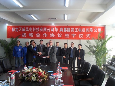 2009年1月22日,傳統的新春佳節之際, ABB 再傳喜報,位於上海的ABB高壓 電機 有限公司與保定天威 風電 科技有限公司簽署戰略合作協議,將共同建立一個1.5MW/50Hz的風力發電機合作項目。根據協議,ABB將負責研發和製造所需要的風力發電機並根據工程有關要求提供設計與技術支持,天威風電負責將這些發電機應用於風力渦輪機組。
