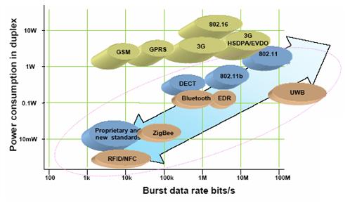 從圖一我們可以看出,rfid技術(iso15693,iso14443, iso-18000 等標準),適合極近距離通訊,具有非常低的功耗;zigbee無線網絡技術(ieee802.15.4)適合數0.25mbit/s的通訊速度,也具有很低的功耗;藍牙(bluetooth)技術(ieee802.15.1),目前2.1版本的規範,可以達到2mbit/s的通訊速率。屬於低功耗通訊,wi-fi技術,從ieee802.11b (11mbit/s)到ieee802.11g(54mbit/s)到目前ieee802.11n,可以實現大於100m bit/s通訊速率;gsm和gprs數據通訊速率不高,但是網絡廣泛,通訊距離遠,隨著3g網絡的發展,也有發非常廣闊的應用空間。