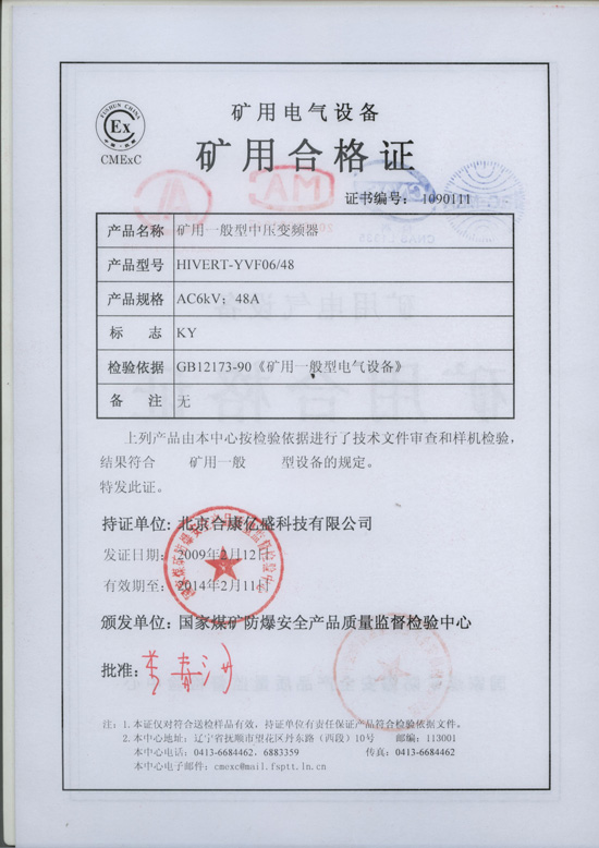 2009年2月12日,北京合康億盛科技有限公司與山東某礦業集團合作的6kV/315kW井下高壓變頻器,通過了國家煤礦防爆安全產品質量監督檢驗中心檢驗,取得礦用一般型KY認證。
