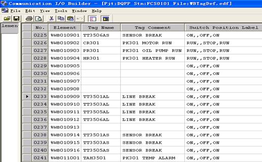 對於數字量通訊,在定義完硬件地址A30061等參數後,要記住%WW0109地址,然後如圖10在FCS0101的SWITCH中定義通訊點變量詳細地址。注意,由於1Word=8Byte=16Bit,因此%WW0109對應%WB10901~%WB109016,可以定義16個數字量。按照PLC程序提供的通訊變量順序定義地址,如圖11所示。其中Tag Name是在CS3000係統中調用的變量名稱,如變量TT3506AS就是溫度傳感器故障報警信息,在DCS流程圖中的調用見圖12所示。