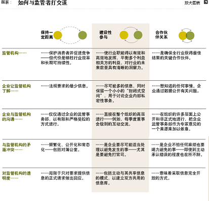 實際上,當企業在嚐試與監管者打交道時,有三種可供選擇的方式(見圖表)。它們可以與監管者保持一定距離,經常處於對抗關係——盡可能減少與監管者溝通交流,敷衍應付其要求,並采用合法手段(如上訴和質疑)jinxingduikang。erzailingyigejiduan,tamenyekeyishefayujianguanzhejianlihezuohuobanguanxi。genjuqiyedeguandian,zheliangzhongmoshitongchangdoubushizuijiafangshi。baochiyidingjulidefangfashiqiyehennanyujianguanzhedachengtuoxie,congerhuichanshengduikangxing。erhezuohuobanmoshibidinghuishibai,yinweijianguanzhebenzhishangshi“警察”而不是“夥伴”。一種比較好的方法——而且不僅是在經濟危機時期——shikaichengbugongdijinxingduihua,mudeshiyujianguanzhejianlijuyoujianshexingdeguanxi。jinguanshuangfangdefenqishinanyibimiande,danwuluncongzhanlveshanghaishizhanshushangkaolv,qiyerengrankeyicongjianlihuxinhepeiyangchangqixiezuoguanxizhonghuoyifeiqian,shuangfangbujinkeyizaiyixiejiaoxiaodexingyewentishangjinxingxiezuo,yekeyizaiyixiekenengshejijiaodashehuizhengzhifanweidewentishangjinxingxiezuo。