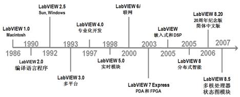 LabVIEW從最初就被設計為一種強大的高層架構型編程語言,自1986年1.0版誕生以來,縱觀其20多年的發展(圖1),可以發現,每次LabVIEW的主要升級版本的發布都包含了很多全新的特性。