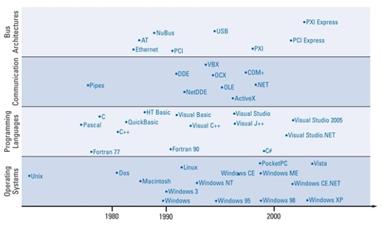 LabVIEW 3.0首次實現了多平台兼容的特性,保證相同的代碼可以運行在多個操作係統中;LabVIEW 5則推出了實時(Real Time)模塊,允許工程師們將在主機上開發的LabVIEW代(dai)碼(ma)進(jin)行(xing)自(zi)動(dong)編(bian)譯(yi),使(shi)其(qi)運(yun)行(xing)在(zai)實(shi)時(shi)硬(ying)件(jian)對(dui)象(xiang)中(zhong)。通(tong)過(guo)降(jiang)低(di)在(zai)實(shi)時(shi)係(xi)統(tong)中(zhong)部(bu)署(shu)代(dai)碼(ma)的(de)複(fu)雜(za)度(du),這(zhe)個(ge)創(chuang)新(xin)的(de)理(li)念(nian)幫(bang)助(zhu)工(gong)程(cheng)師(shi)以(yi)一(yi)種(zhong)更(geng)方(fang)便(bian)的(de)方(fang)式(shi)進(jin)行(xing)控(kong)製(zhi)應(ying)用(yong)的(de)開(kai)發(fa);而LabVIEW 7與FPGA技術的結合則又是該理念的進一步升華,從而讓不具備VHDL編程經驗的工程師們也同樣可以進行硬件設計,並且LabVIEW本質上的數據流並行性非常符合FPGA並行電路特性,在此基礎上可以達到很好的空間利用和定時性能;LabVIEW 8.2作為20周年的紀念版,首次推出了中文版,使中國工程師們也能用自己的母語編程,最大程度地提升開發效率;最新的LabVIEW 8.5則更為多核處理器技術提供了強有力的支持,同時也推出了基於UML語言規範的狀態圖設計模塊。綜合而言,LabVIEW通過不斷地融入最新商業可用技術(圖2),讓使用者無需花費過多的精力去學習每個技術的細節就可以直接使用,提升了係統的性能,保證了工程師們長期的投資。