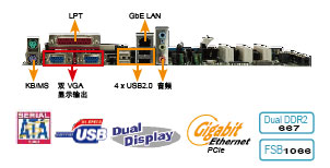 8482;2 Duo, Pentium®D/ Pentium®4/ Celeron®D FSB533/800/1066MHz LGA775 封裝處理器,支持PCIe mini / PCI 擴展及雙VGA顯示輸出。