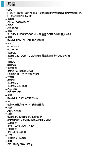 IMBA-9454B 芯片組采用Intel® 945G+ICH7組合,內存支持2 x 240-pin 400/533/667 MHz 雙通道 DDR2 DIMM (最大可達 4GB),支持3 x PCI,1 x PCIe x1,1 x PCIe mini 擴展槽。