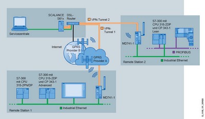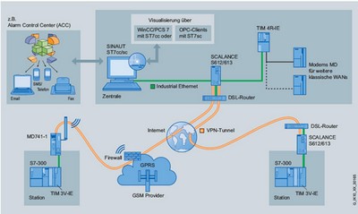 如同所有SINAUT網絡的情況,遠程編程和遠程診斷對於GPRS連接也是支持的。相對於GPRS四到五倍高的速度使得EGPRS顯著地便於遠程編程和遠程診斷。下麵兩張圖顯示了可能的配置: