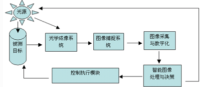 目前,國內機器視覺的應用研究如火如荼,但不論是將機器視覺應用於工業、農業、軍事、科學研究的各項領域,都離不開機器視覺開發平台的搭建。機器視覺是一項綜合技術,包括圖像處理、機械工程技術、控製、電光源照明、光學成像、傳感器、模擬和數字視頻技術、計算機軟硬件技術(圖像增強和分析算法、圖像卡、I/O卡等)這些技術在機器視覺中是並列關係,相互協調應用才能構成一個完整的工業機器視覺應用係統。一個典型工業機器視覺係統如下圖所示: