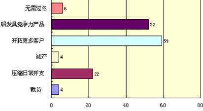 7.如何過冬:參與調查的企業中,在是否將采取措施準備度過經濟危機方麵,有6家表示前景明朗,無需過冬。其餘75家企業中,隻有4家企業考慮裁員,4家企業減產,其餘多數企業均表示要通過研發更具競爭力產品和開拓更多客戶來度過經濟危機。