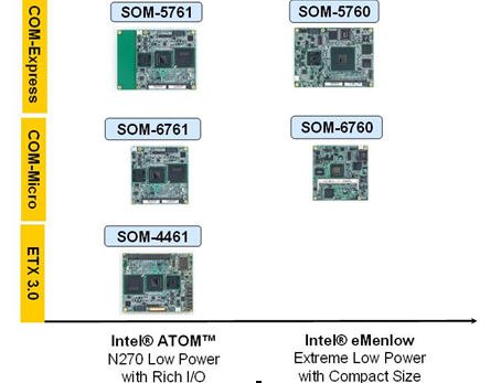 研華即將發布采用 Intel® Atom Z530 解決方案的 SOM-5760 COM-Express 模塊,該模塊可用於要求超低功耗、長電池壽命的消費類手持設備中。采用 Intel® N270 平台的 SOM-5761 可提供多種 I/O 接口,如 PCIe、PCI、USB 和 SATA,非常適合用於低功耗應用中。