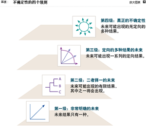 Courtney對企管戰略文獻的貢獻之一是一個包括四級的思維框架,這個四級框架幫助管理人員確定戰略決策中所涉及的不確定性水平。第一級:未來的前景明確單一;第二級:未來可能出現有限的一組結果,其中之一將會發生;第三級:未來可能出現定向的多種結果;第四級:未來可能出現不計其數的無定向結果。馬裏蘭大學Robert H. Smith商學院負責高管課程的副院長兼戰略執行教授Courtney在最近接受《麥肯錫季刊》專訪談時討論了這一思想的現實應用。