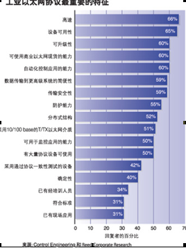 在被問及的34個特征選項中,高速能力(66%)被列為最為重要的特征。緊隨其後的依次是設備的可用性(65%)、可升級性(60%)、可使用商業以太網現貨的能力(60%),以及用於自動化控製應用的能力(60%)。