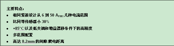 新型傳感器的設計特別針對驅動器和逆變器所使用的先進技術,這些先進技術要求以下方麵具有更好的性能,其中包括共模影響、熱漂移(失調和增益;根據不同的型號,對於基準電壓獲得從7到30 ppm/K的最大熱漂移)、反應時間(小於0.3微秒)、絕緣等級和尺寸。