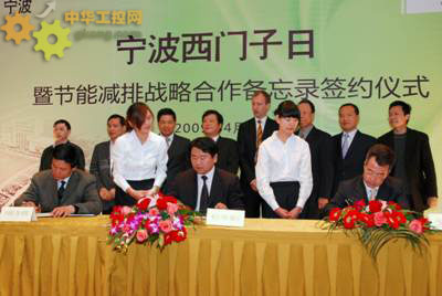 浙江省寧波市, 2009年4月7日,西門子(中國)有限公司、浙江省寧波市北侖區人民政府和中控科技(寧波)研究院共同簽署節能減排戰略合作備忘錄,建立廣泛的合作夥伴關係,加快節能環保城市的建設。西門子全球領先的“綠色”業務組合,結合北侖區的節能潛力和中控科技(寧波)研究院的高新技術平台,將進一步推動節能示範項目的進程和城市的可持續發展,創造“三方共贏”的良好局麵。西門子(中國)有限公司高級副總裁、華東區及上海分公司總經理孟凡辰博士,寧波市常務副市長王勇先生出席了今天的簽約儀式。