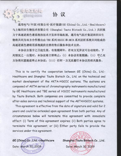 2009年3月30日,通用電氣(中國)有限公司-醫療集團(GE (China) Co.,Ltd.- Healthcare)與上海同田生物技術有限公司(Shanghai Tauto Biotech Co.,Ltd.)繼續簽定了合作協議,共同致力於高速逆流色譜係統的技術開發和市場拓展, 通用電氣醫療集團和同田生物將共同為雙方合作推出由TBE係列HSCCC和AKTA係列層析係統共同組成的高速逆流色譜聯用係統提供完善的售後服務和技術支持。本協議每2年簽定一次,自簽字之日起生效,有效期為2年.