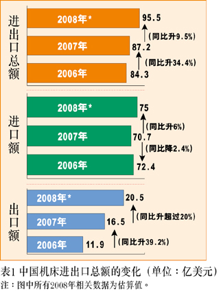 在全球經濟增長明顯減速和美、日、歐三大經濟體陷入衰退的背景下,我國機床出口快速增長的局麵將發生逆轉,2008年9月以來出口合同減少便是一個徵兆。不過,在政府提高出口退稅率的支持下,通過市場多元化戰略和改善出口產品結構,2009年我國機床出口額雖然可能出現負增長,但降幅不至於太大。